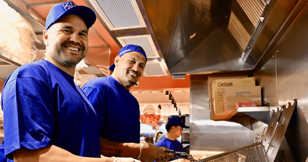 NRL stars and podcast duo Willie Mason and Justin Horo surprised patrons by taking over service at Pappa Flock, coinciding with the relaunch of the eatery's original location.